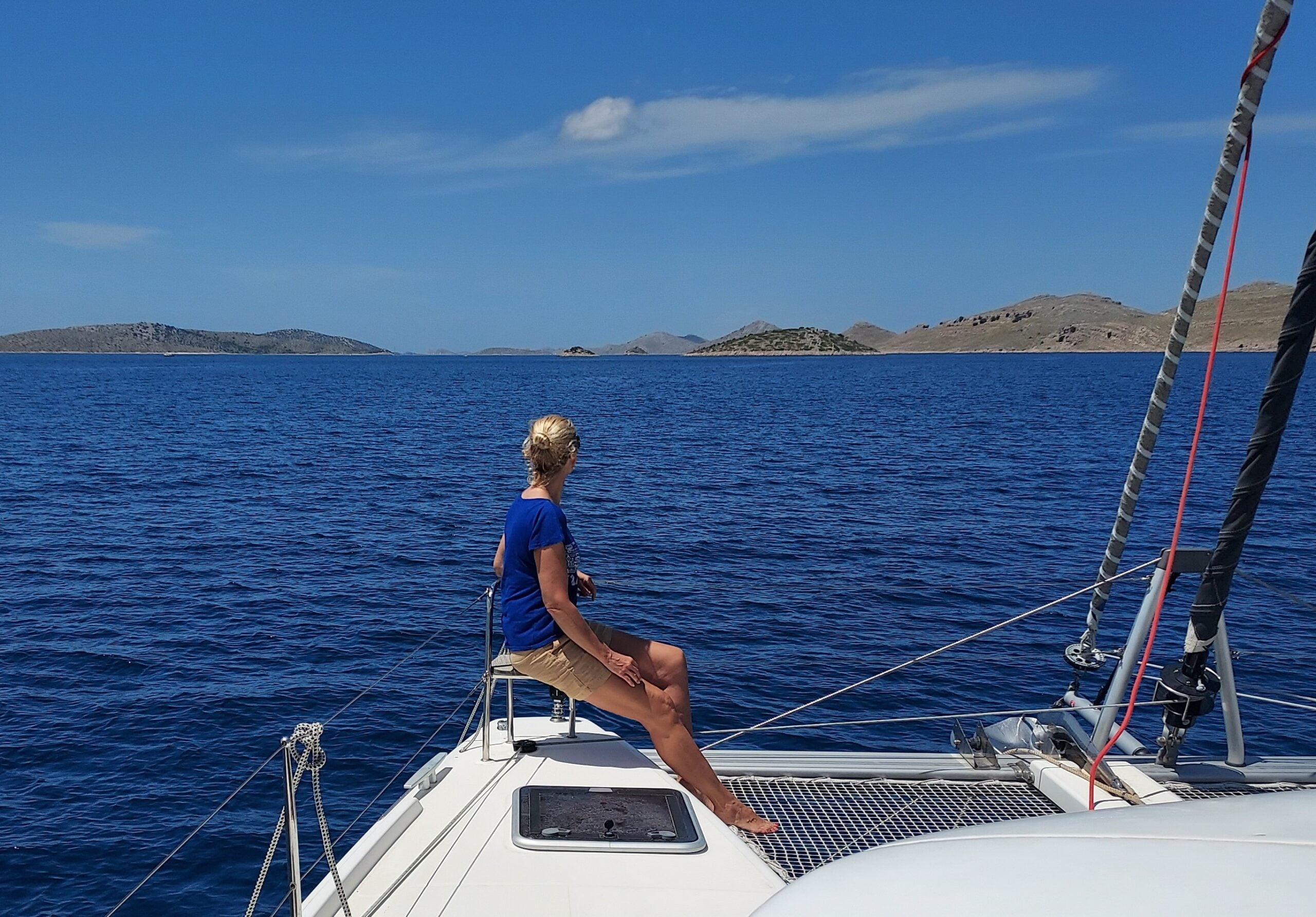 We sailed from the coast of Croatia to this island group. And because the wind was on the back of our boat, we used a sailor’s technique that is called ‘milk girl’ where you place 2 sails (the jib and the code zero) in their most outer position to get the catch most of the wind from the back of the ship. The name ‘milkmaid’ originates from the famous paining of Vermeer ‘The Milkmaid’, because when she walks in the wind, the flaps of her cap blow out wide and that looks similar to the position of the sails below! To me it’s also a symbol for our lifestyle now: ‘spread your wings’ and fly😉!