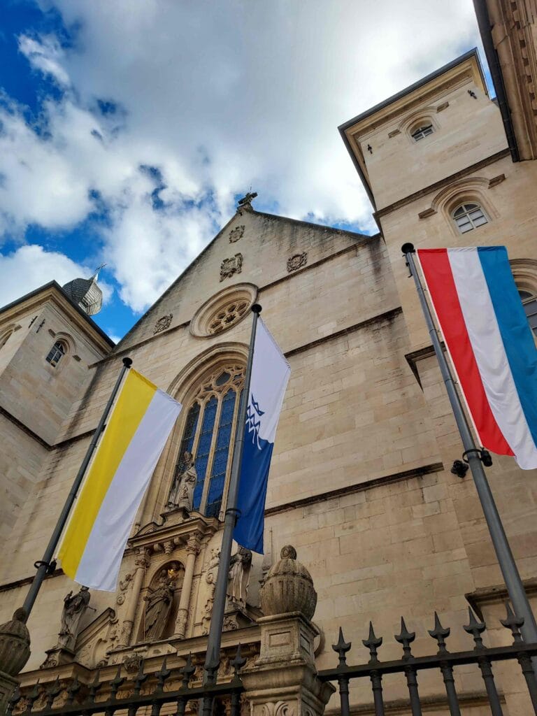 Below on the left you see the Cathedral of Luxembourg. This gothic cathedral, officially the Cathedral of Our Lady, is an important religious building in the city and is known for its impressive architecture and serene atmosphere. Inside you will find beautiful stained glass windows and works of art. The pope had just visited the cathedral, which is a big event of course. In addition to the red/white/blue flag of luxembourg you can also see the white/gold flag of the vatican fluttering.