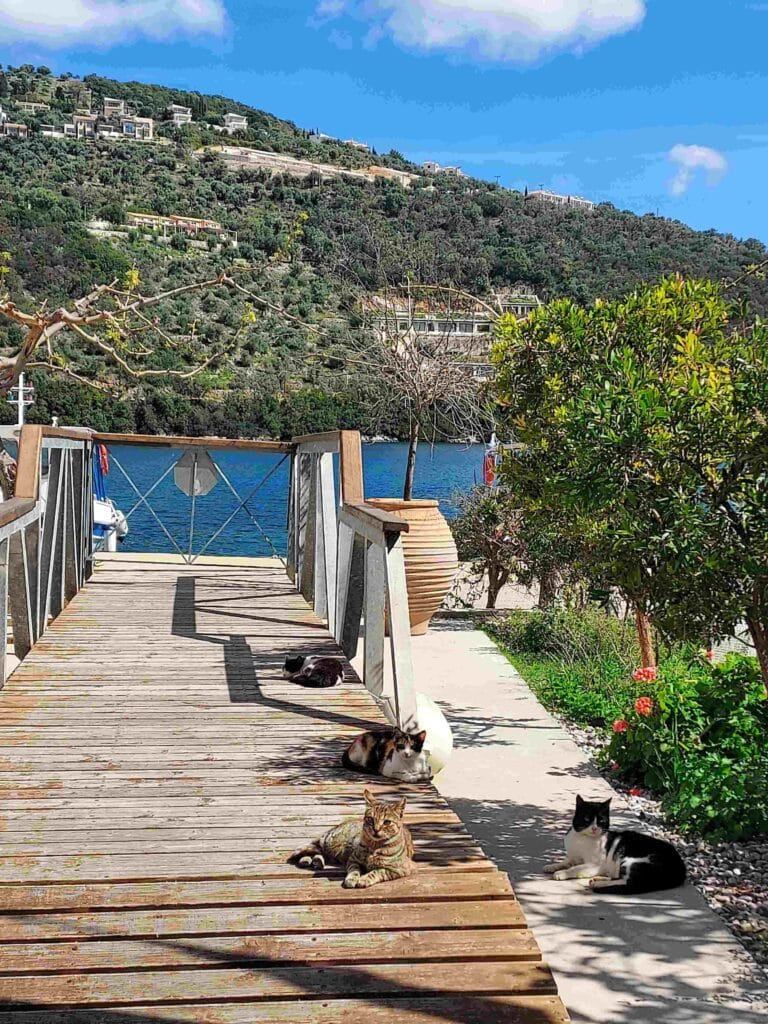 So all the hotel signs are essentially waiting for the new season again; from May/June onwards it gets busier. The ones that always remain are the cats. Greece is known for its large number of (stray) cats. You see them everywhere: in the villages, in the harbour, in restaurants. They simply sit next to your chair hoping to get something. They also regularly come aboard when you’re moored; don’t be surprised if you’re walking on your boat and suddenly a cat passes outside your window. It then gets startled and quickly jumps off the boat again!