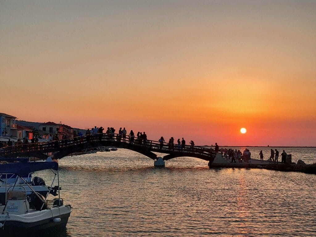 And because we are increasingly heading west, we also get beautiful sunsets, like here where we were “front row” with the boat next to a small bridge — perfect for watching the sunset.