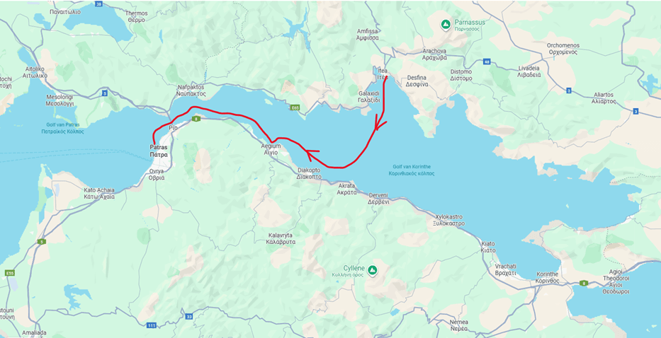 After visiting the impressive complex of Delphi in the northern part of the Gulf of Corinth, we continued sailing westward toward Patras. This is the “exit” of the Gulf of Corinth, which then turns into the Gulf of Patras.
