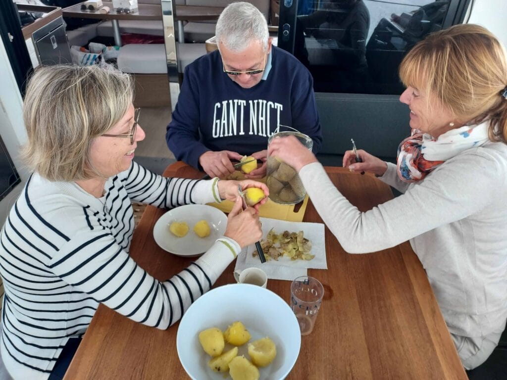 On the first day, as with all guests, we did a full week of grocery shopping. Everyone cooked their favorite dish once during the week, and otherwise we went out for dinner 😉. The first evening was Gilles’ turn, with his famous BBQ and Indonesian satay skewers. Birgid knows that I love potato salad, and she always makes it fresh. So after lunch, the Luxembourgers got to work on the potatoes we had bought, already mixing them with the dressing for the evening.