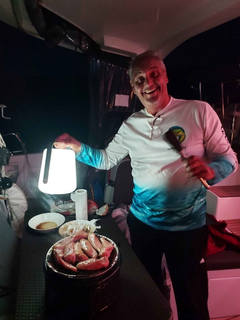 So after instructions from Gilles, I went up the mast again, taking tools with me in the side pockets of the “chair” (bosun’s chair) used to hoist you up. It worked, and the anchor light was shining brightly again at the top of the mast! Now I had some time to make a short movie of the anchor light and what it looks like when you are hanging at the top of the mast: