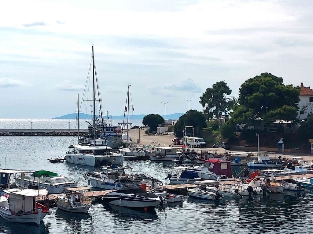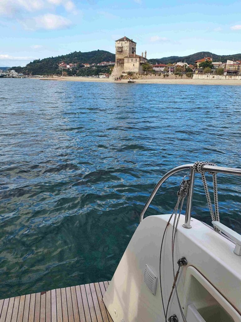 The weather was beautiful as we set off, slowly heading south along the coast. From the sea, you can immediately see the difference between Kassandra and the other “fingers” of Chalkidiki: this part is flatter, more densely populated, and livelier.