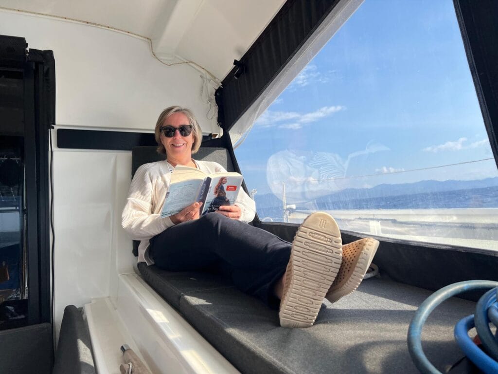 We continued sailing south along this peninsula. The sea was calm, so everyone could relax and enjoy the sunshine or read a book.