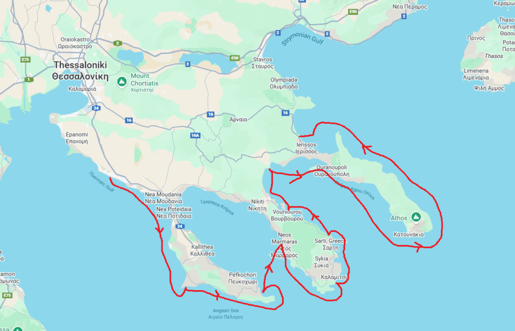 After the beautiful Sporades islands, we headed back to mainland Greece. North of the Sporades lies Chalkidiki. When you look at the map of Greece, its shape immediately stands out. This region consists of three long peninsulas stretching into the deep blue Aegean Sea: the westernmost is Kassandra, followed by Sithonia, and then Agion Oros. Although they are similar in shape, they are very different in character.