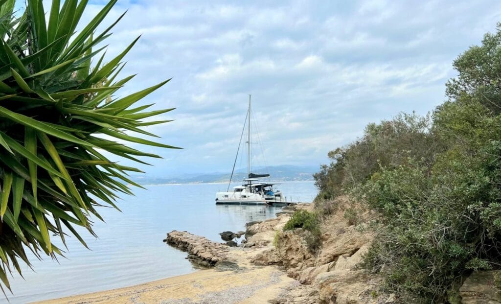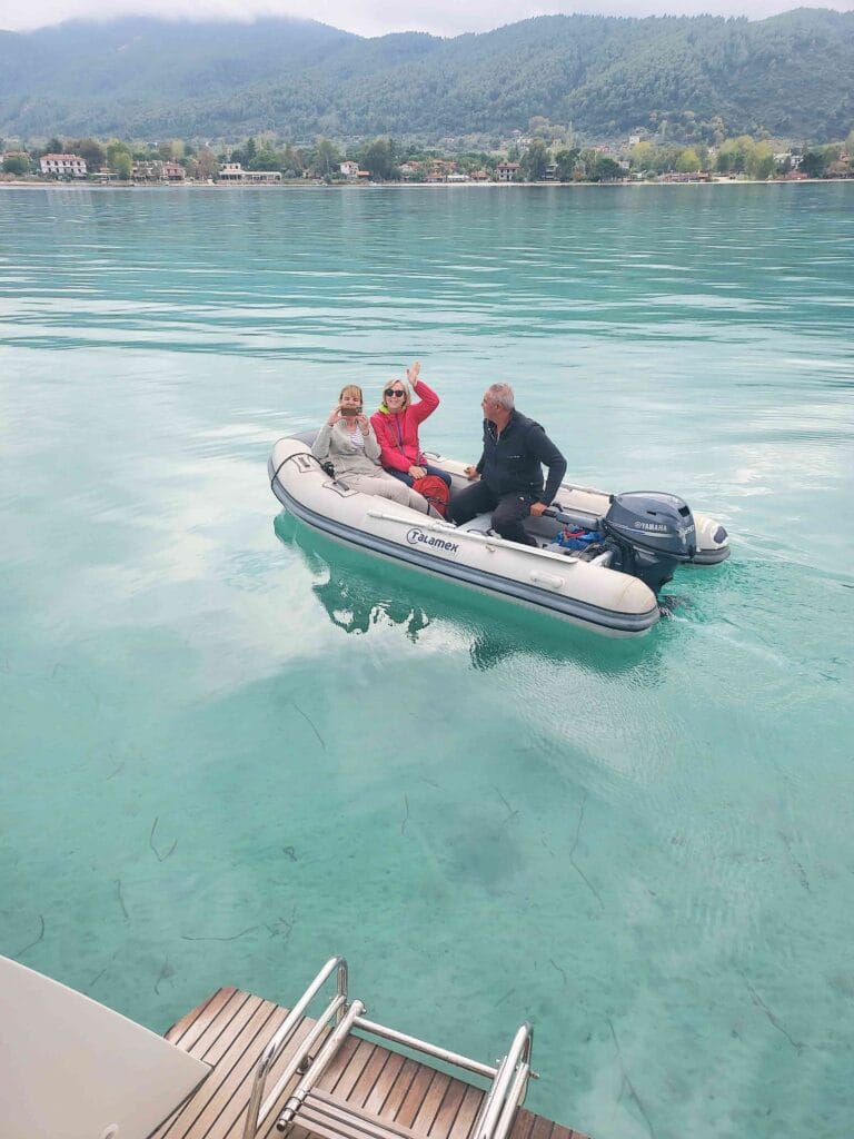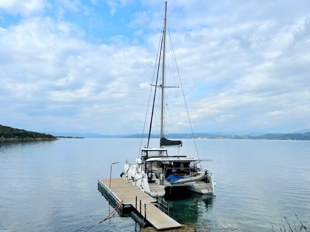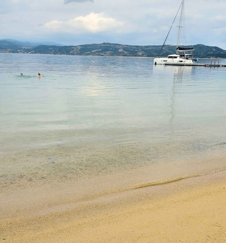 We now reached the east coast of the second peninsula. It became a bit busier again, with picturesque places including Vourvourou. This area is known for its lagoon-like waters. We took the dinghy ashore, and indeed the catamaran lay in a shallow bay with beautiful light-blue water. Once again, charming Greek spots to explore.