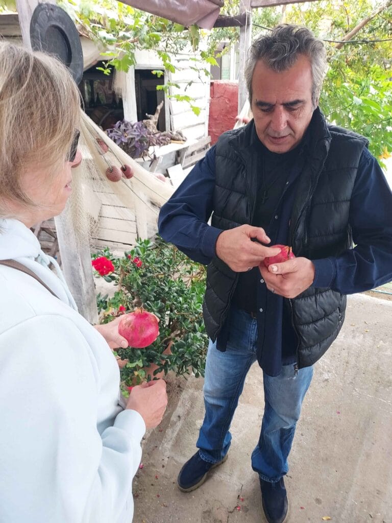 We saw a beautiful restaurant with a colorfully decorated terrace. The owner chatted with us, and we complimented him on his restaurant. He picked a pomegranate and gave it to us—to bring good luck.
