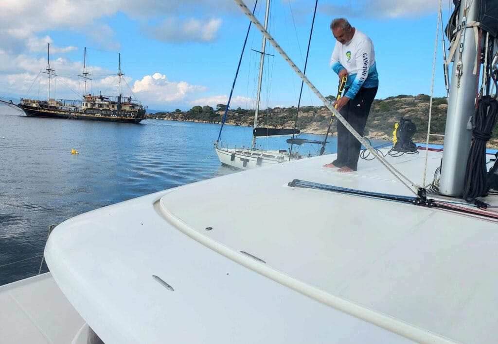 At the last anchorage, Charles pointed out that our anchor light wasn’t working. Apparently, after six years the battery was dead. So we managed to buy a spare anchor light, and I went up the mast to replace it. So I thought. Just replacing the light or the battery—but it turned out more was needed. The anchor light had to be unscrewed and the two wires had to be reconnected in the terminal block. And all of that at 22 meters up, right on top of the mast.
