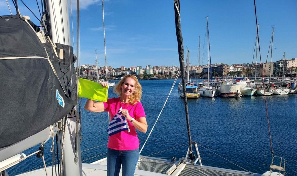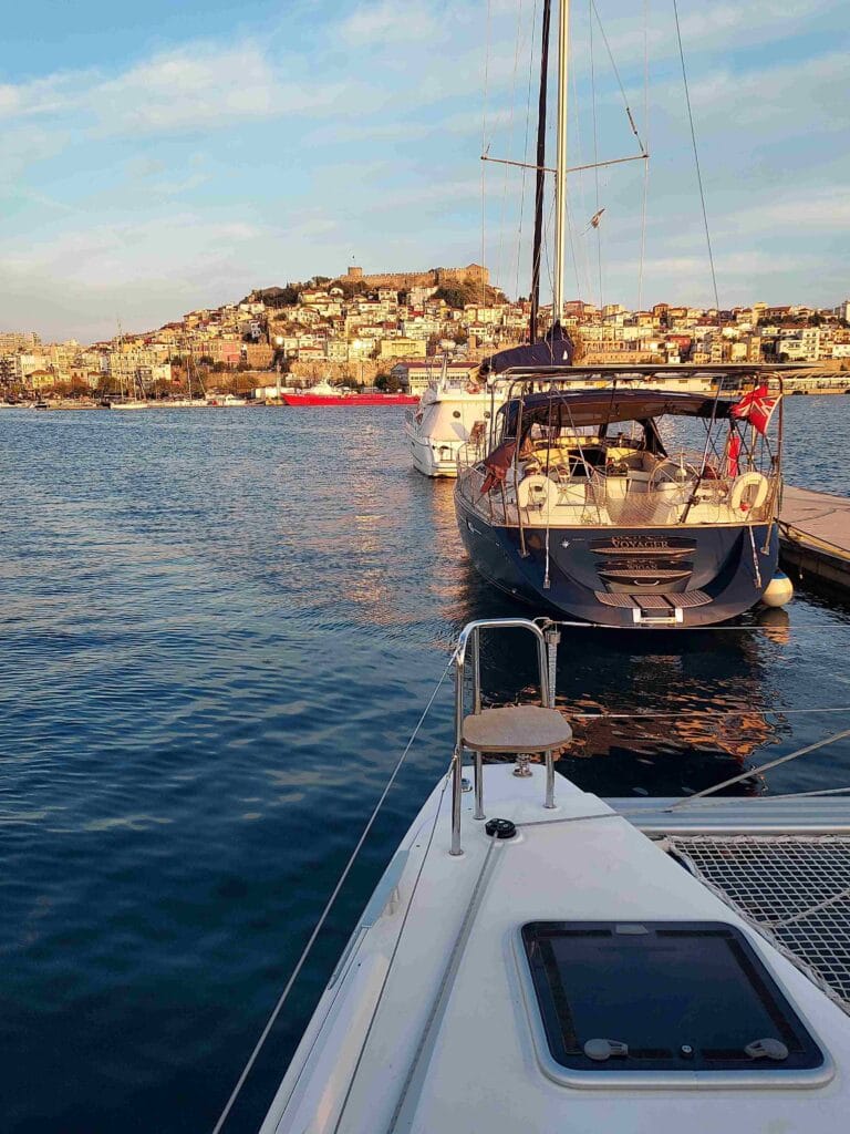 Because officially, when leaving one country (Greece) and entering a new one (Turkey), you are required to fly the bright yellow quarantine flag. This signals to authorities at sea and on land that you are not allowed to go ashore because you are between two countries and must continue sailing until you reach the first port of entry in the new country. There, you must dock at a customs pier, and only after all paperwork is in order are you allowed to step ashore.
