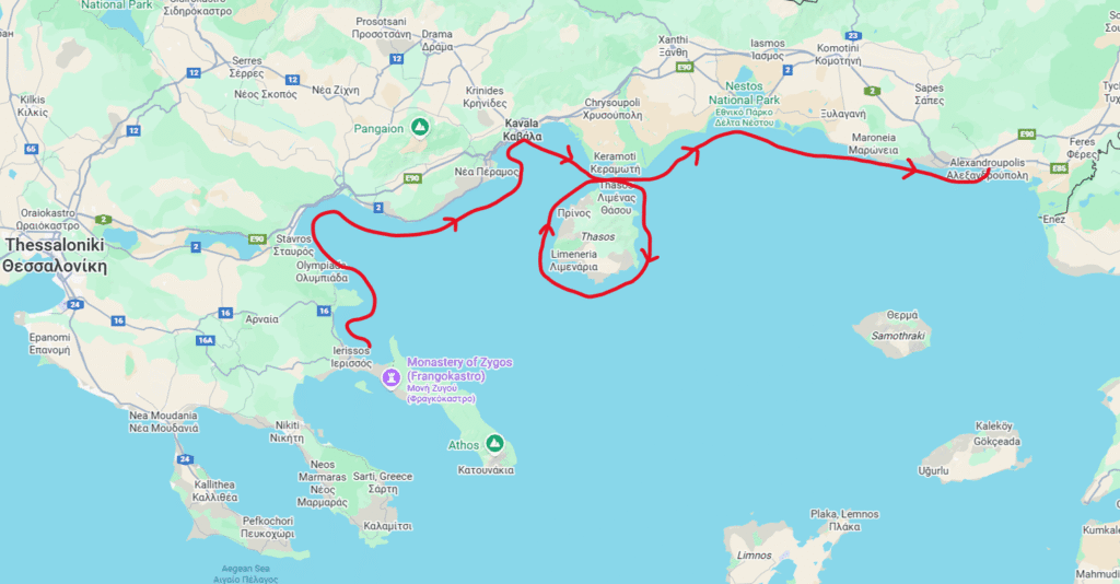 We then continued sailing eastward, passing the places Kavala, the island of Thasos, and ending in Alexandroupoli—the last place in Greece before the Turkish border comes into view.