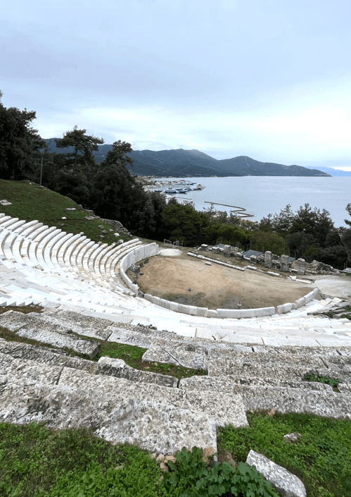 We arrived in Thasos Town, where we could moor nicely along the quay in the harbor. The most interesting sight in Thasos Town is the ancient Agora—a site with old temples, remains of sanctuaries, an ancient theater, and other buildings. The ancient Agora was the political, administrative, and religious center of the ancient city and is within walking distance of the modern town center. The ancient theater was built in a natural hollow on the hillside.