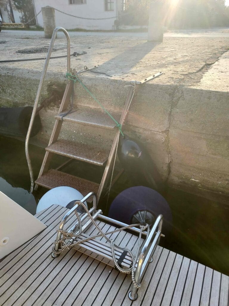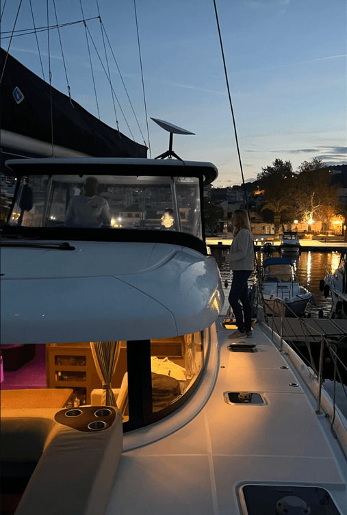 As we approached the quay, we saw that a large market was taking place that afternoon. We also noticed all kinds of iron ladders hanging along the quay! Because the quay was so high, these ladders had been installed as a service for visiting boats. If you dock with a regular sailboat (with one contact point), you can easily position yourself next to a ladder. But we are sailing a catamaran almost 8 meters wide, with two wide, low platforms at the stern (called “sugar scoops”). So we had to carefully protect our two platforms with ball fenders while approaching the quay. Fortunately, we managed to dock without any damage.