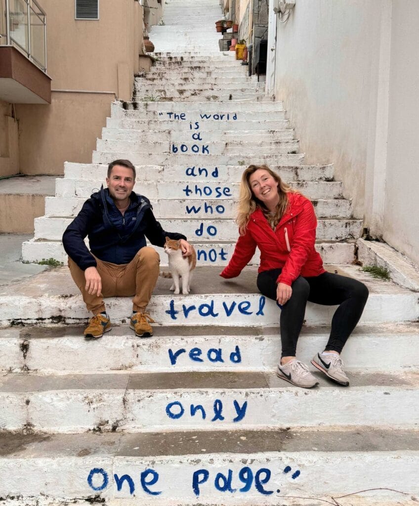 We sailed along the east coast toward the south of the island and went ashore again in the charming town of Limenaria. It was a quiet town, with several restaurants open, and we strolled peacefully among the citrus and olive trees that were nearing harvest. We came across this lovely text on a white-painted staircase—it really spoke to us!