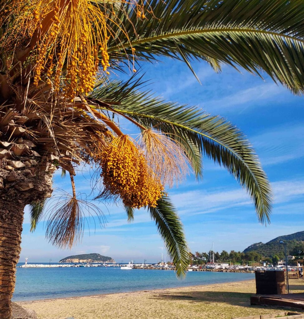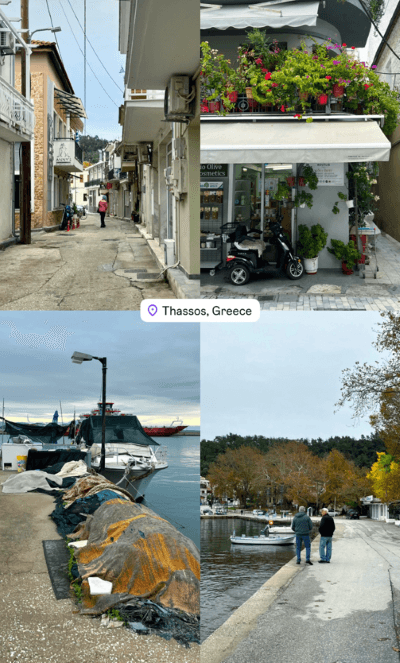 The next day, we continued sailing along the west coast back toward the north of the island. We walked through the sleepy towns and also anchored in a bay. A term you often hear on the island is the prefix “Skala,” which literally means “stair.” This gives rise to villages such as Skala Prinos, Skala Potamias, and Skala Panagias. These are all coastal villages that typically have a connection with a mountain village or inland settlement. While the mountain villages tend to retain a more traditional character, the coastal villages are more oriented toward tourism.\