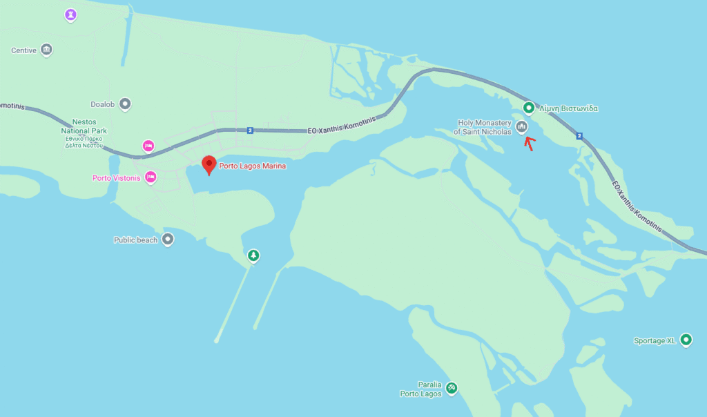 We continued sailing eastward and passed through a delta landscape with lagoons and river forests—very green and, to our great surprise, featuring a well-equipped marina: Porto Lagos Marina.