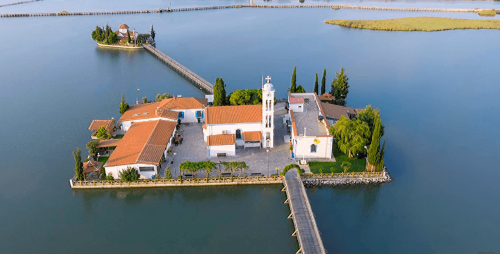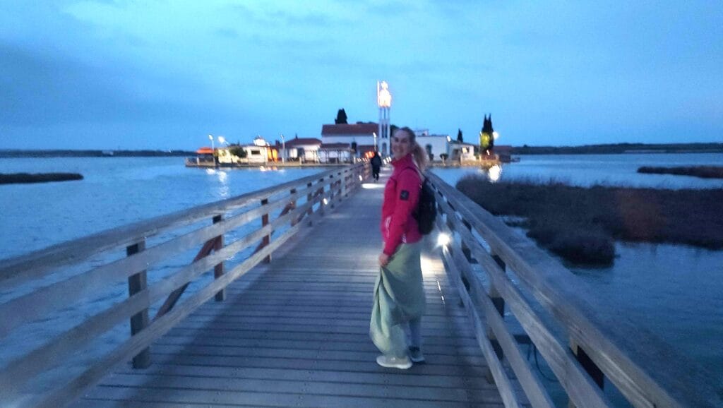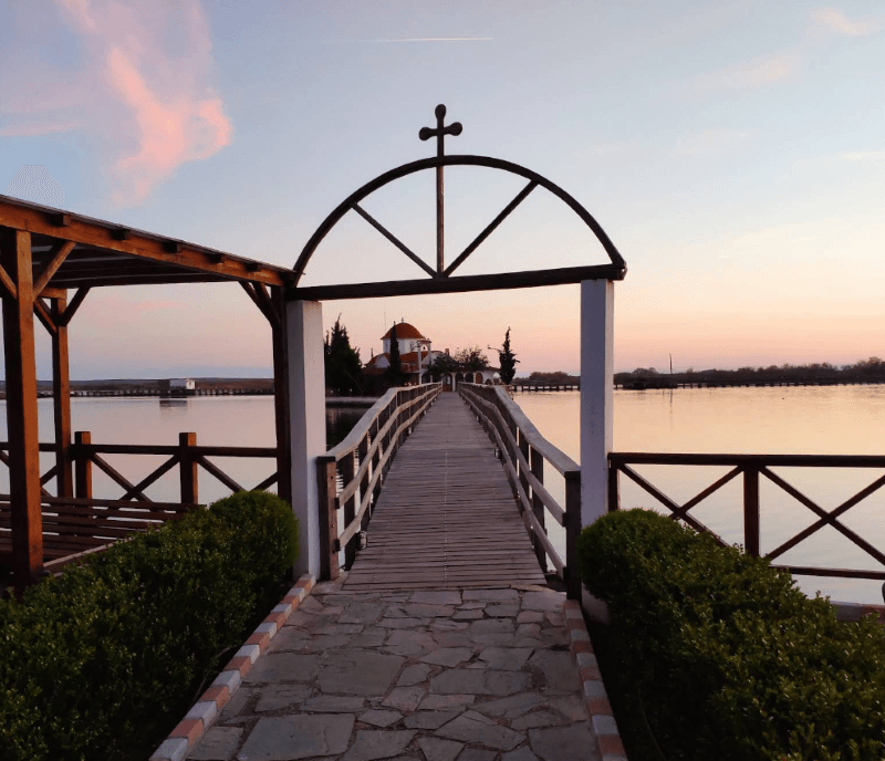 We stayed here for a few days, also to do laundry after a week with guests, clean the boat, and restock at the local supermarket. On the map, we also noticed a beautiful monastery further east in the lagoon, located on a small island. We cycled there in the late afternoon.