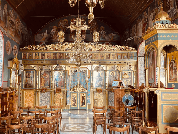The monastery was holding an Orthodox service. We could hear chanting, and when we looked through the stained-glass windows, we saw monks performing a ritual with blessings using holy water and incense (a symbol of prayers rising to God). Through the windows, we could also see many golden icons inside the monastery.