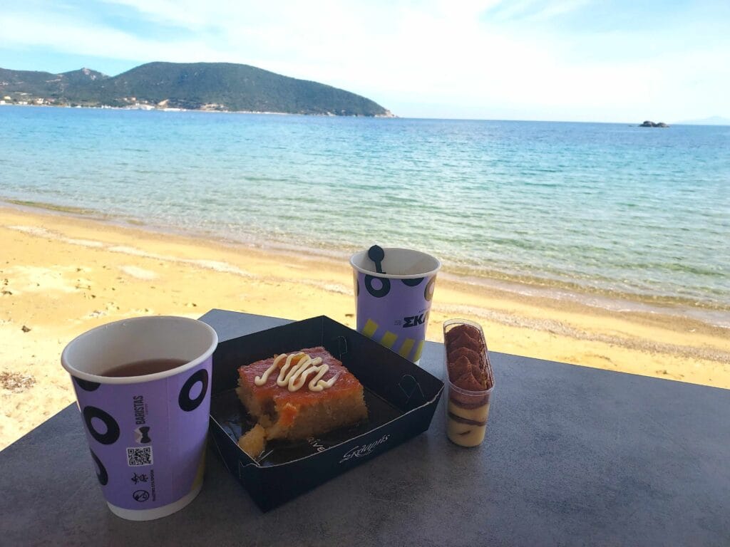 The weather was sunny, so we went cycling regularly, starting from the harbor of Nea Roda. Along the way, we stopped by the beach to enjoy a cup of coffee with a cookie at a small café.
