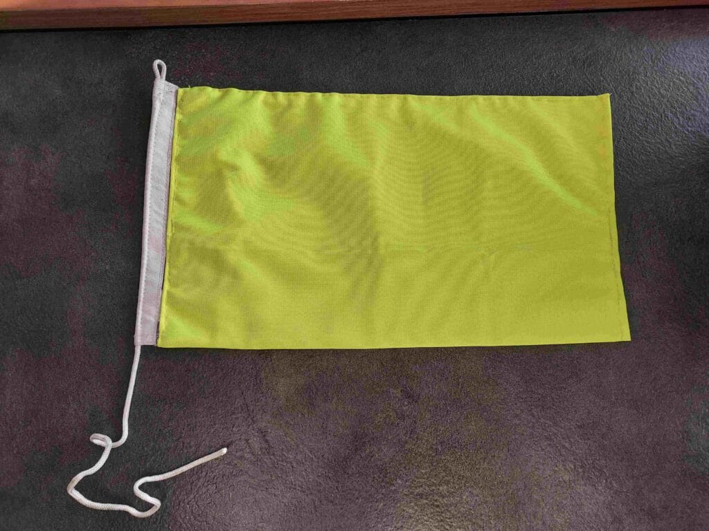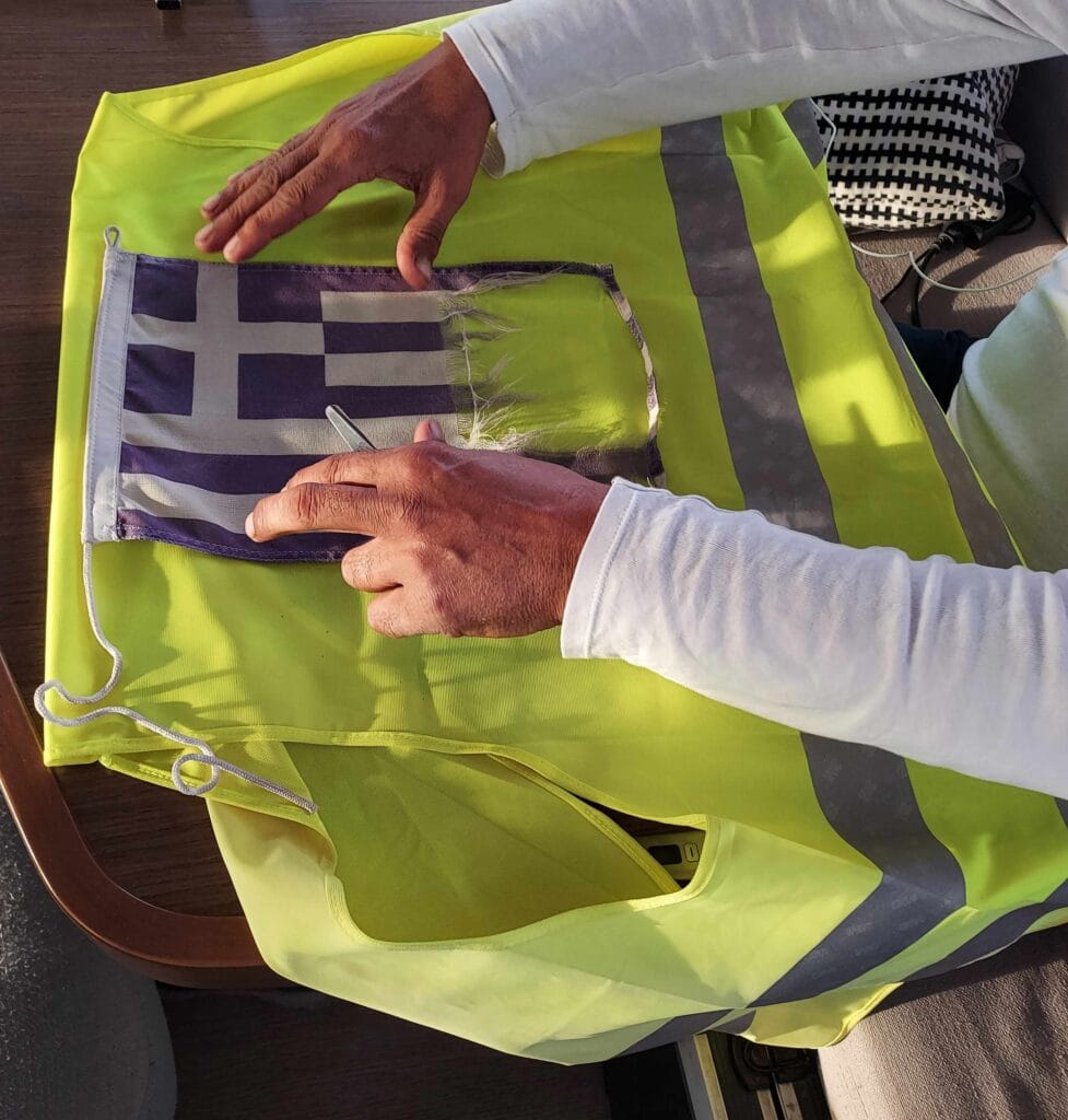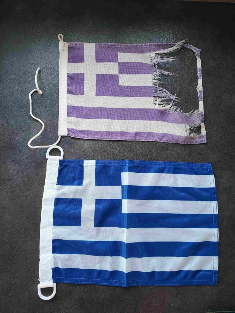 The flag shop didn’t have a yellow flag. The owner was a friendly elderly man who even offered us coffee. While Gilles was looking around the shop and thinking about how we would manage without the yellow flag, he spotted a yellow road worker’s safety vest hanging in the window. He said he could turn that into a flag. So we bought the vest, used our old Greek flag as a template, and the wide white stripe of the vest worked perfectly. And that’s how our quarantine flag was made!