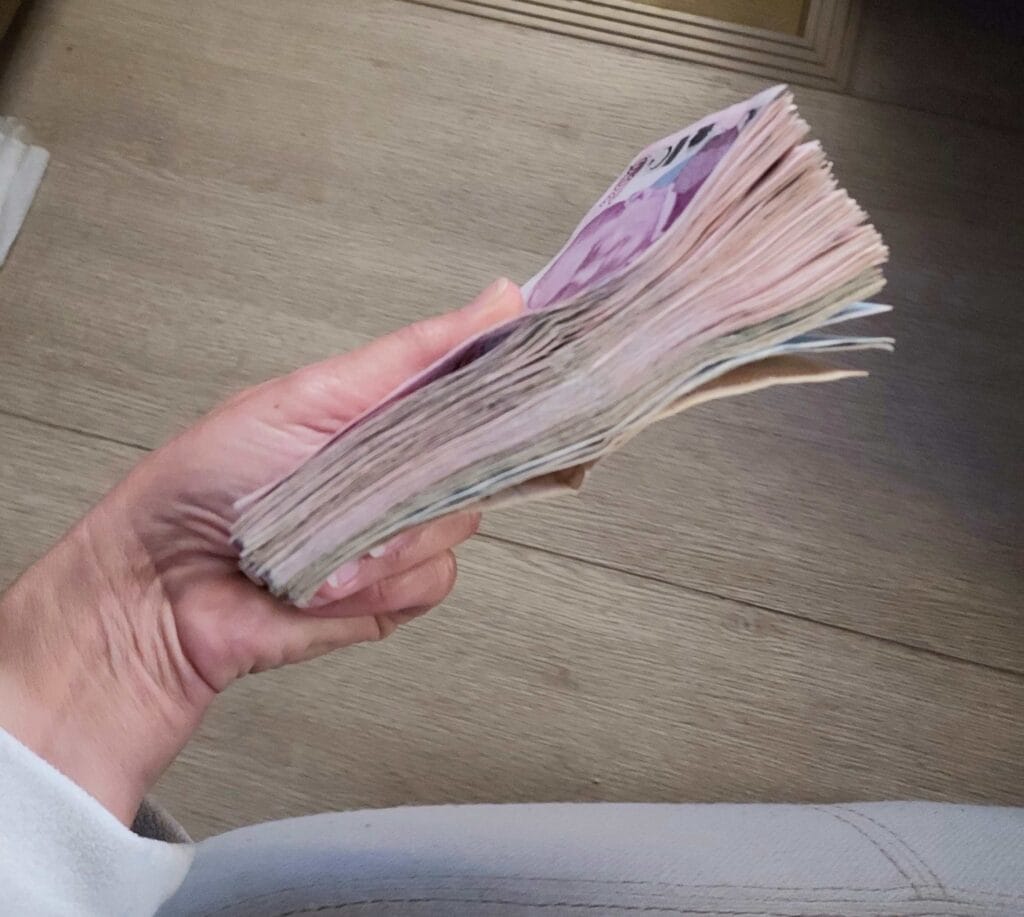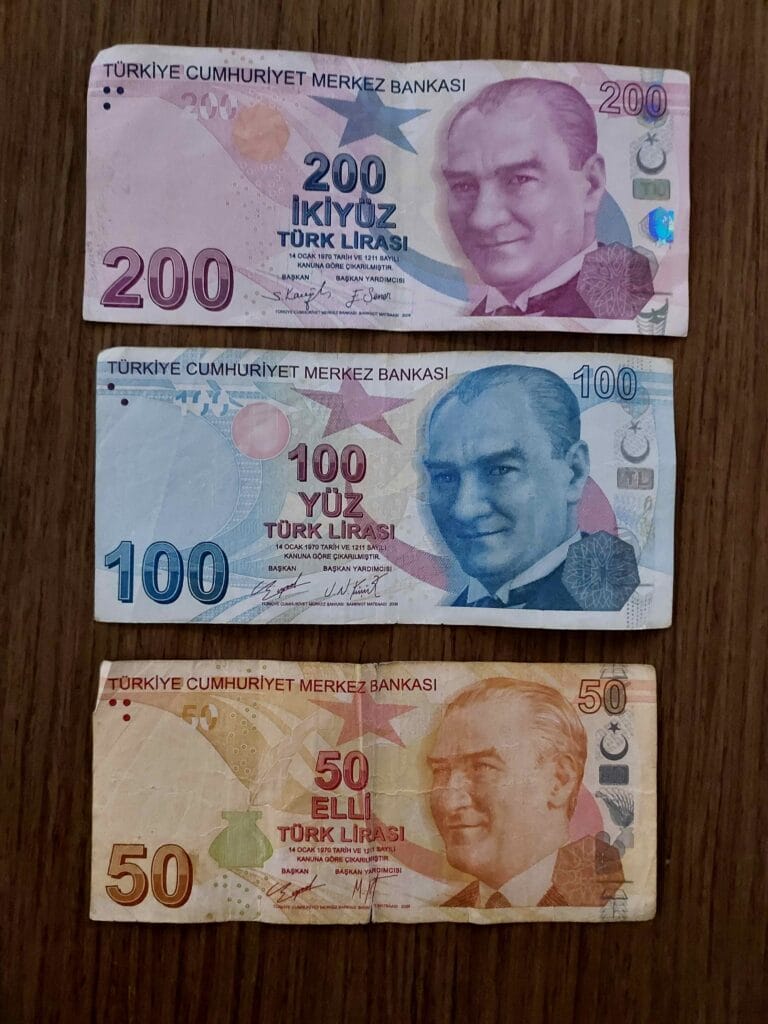 The local currency is the Turkish Lira. Due to inflation, prices involve large numbers — 1,000 lira is roughly €20. I withdrew €400 and received a thick stack of 200 and 100-lira banknotes.