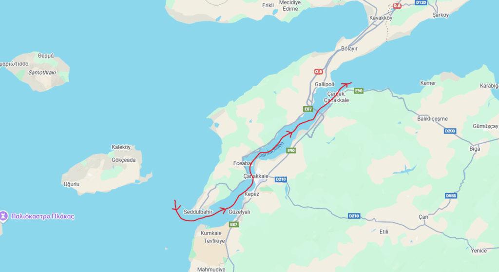 It forms a natural boundary between Europe and Asia, making it one of the most strategic waterways in the world. Ships from the Black Sea pass through here via the Sea of Marmara to reach the Mediterranean and beyond — which explains why the Dardanelles has played such a crucial role in trade and military history for thousands of years.