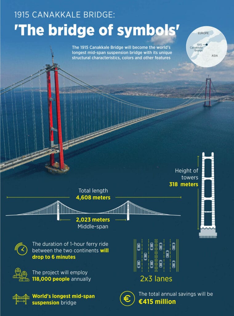 Near the northern part of the strait stands the Çanakkale 1915 Bridge, opened in 2022. With a main span of 2,023 meters, it is currently the longest suspension bridge in the world.