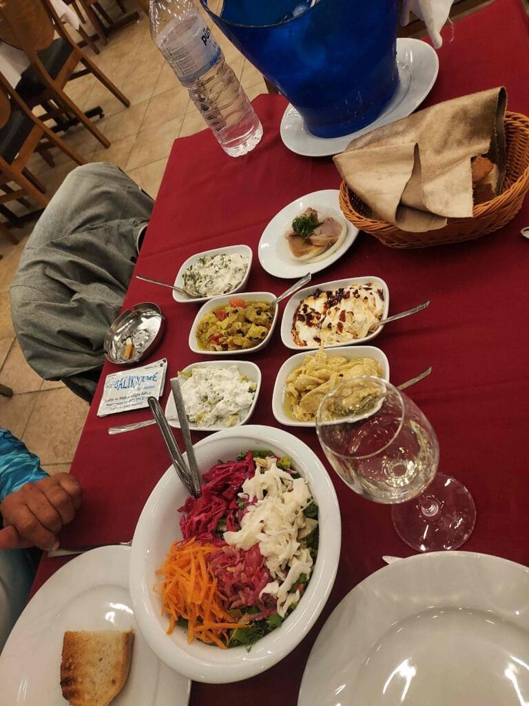We went to the harbour restaurant — we were the only guests — but the owner was well prepared: fresh fish in the display, small mezze dishes, good wine. We had a wonderful meal.