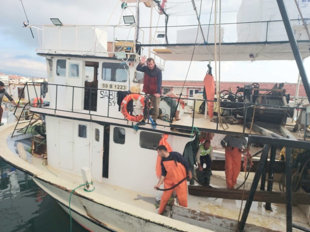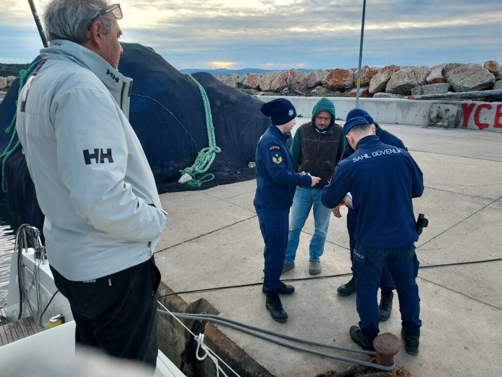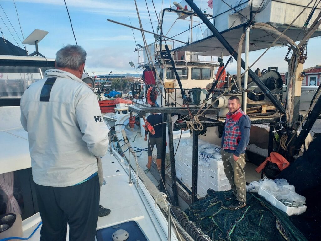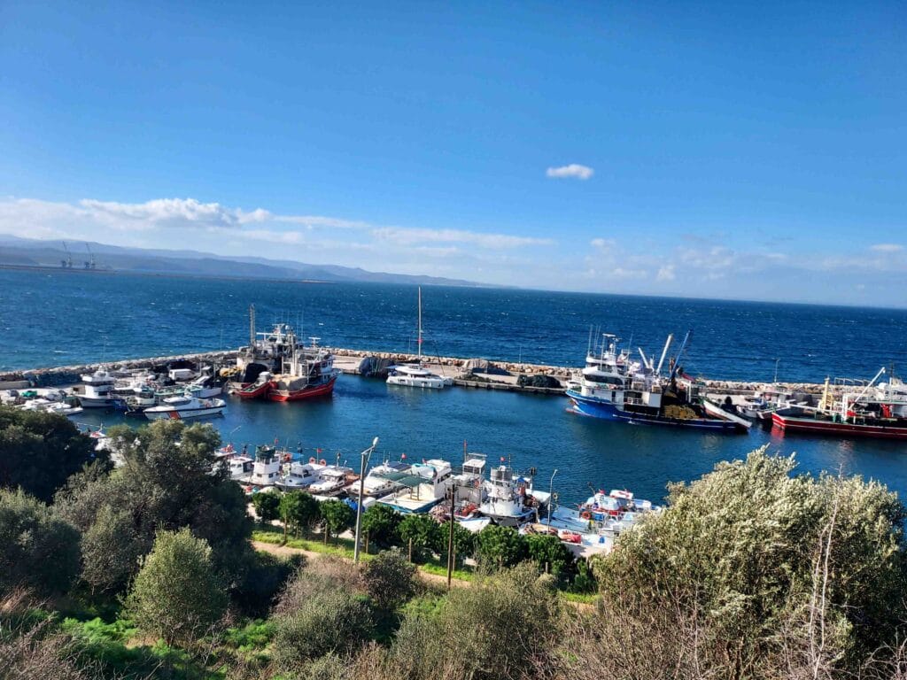 Again we were in a full fishing harbour, but locals helped us find a good spot and other boats doubled up without complaint. The coastguard came to check our papers (never had that so often in one country!) — everything fine. “Where are you from?” Holland. “Ah, many Turks live there — we call it mini-Turkey.”