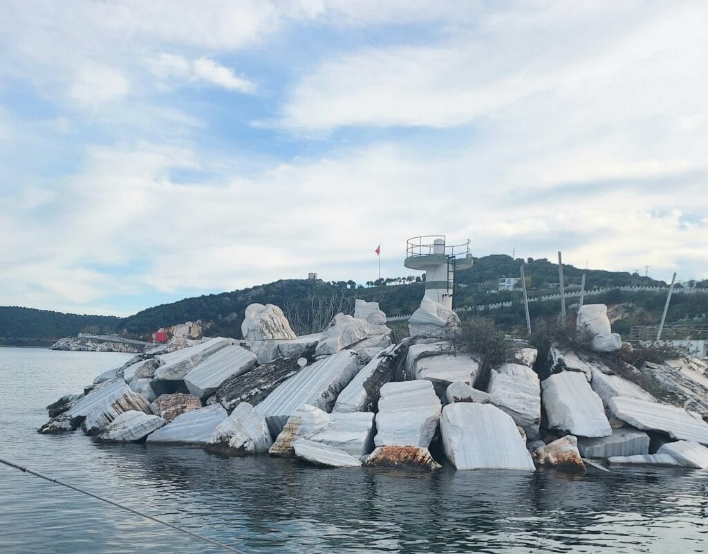 The island after which the Sea of Marmara is named became our next destination. It literally forms the centre of the sea, and it quickly became clear why: the island owes its name to the marble (“marmara”) that has been quarried here for centuries. Upon arrival we could already see the dust clouds of trucks driving in and out of the quarries on the mountainsides.