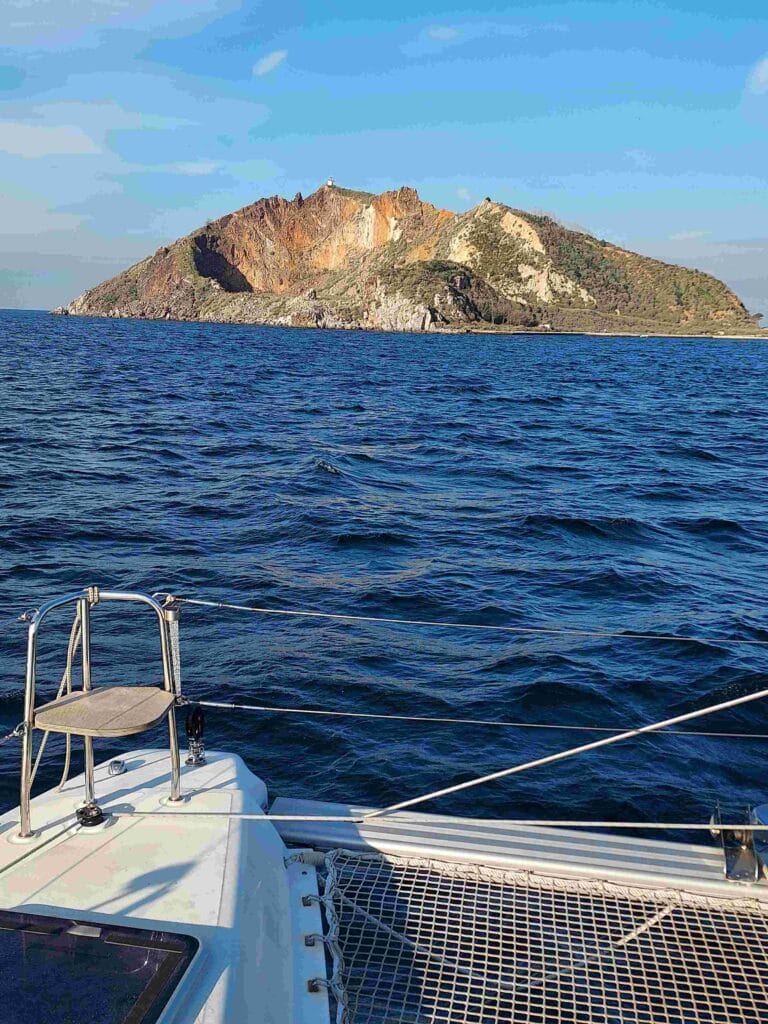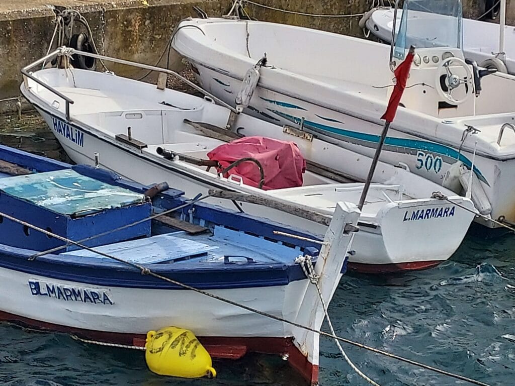 As we entered the harbour, our hearts sank. This fishing port was packed with boats, some of them double-parked, and we could not see any power pedestals. We scanned the quays until we heard someone calling and waving at us. It was Mustafa, who offered us a place alongside their fishing boat. We were very grateful, because it meant we could lie safely and calmly. Mustafa explained that he was connected to the harbour cooperative of fishermen and that he usually helped the occasional visiting tourist boat find a place