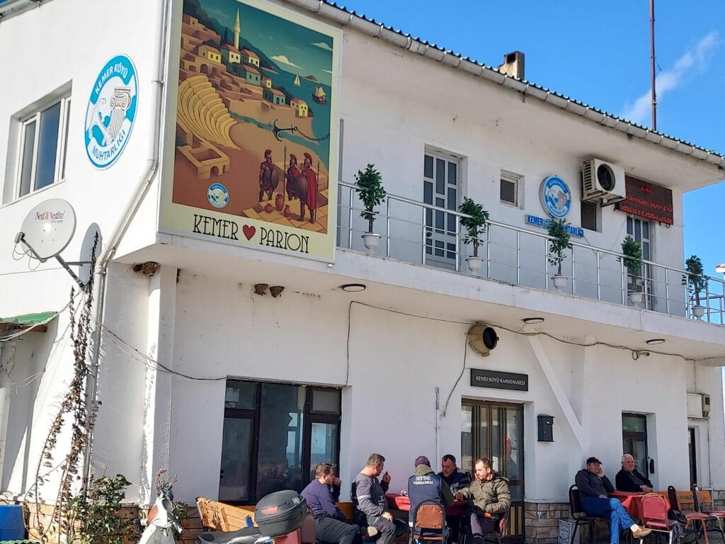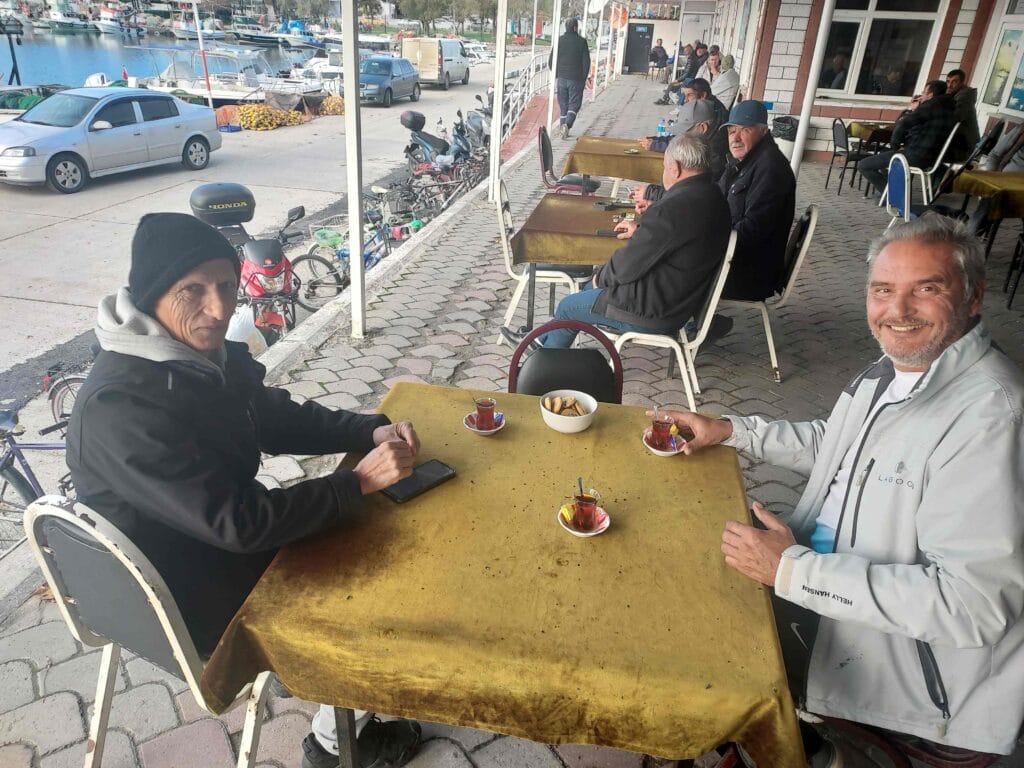 The word çay originates from Persian (čāy) and in Turkey it is so deeply rooted that “çay” is almost synonymous with hospitality. Wherever you go — from a marina office to a small village café — you are almost always offered a glass of çay before any business is discussed (which turned out to be true, because afterwards we did have to pay for this “berth”). Drinking çay is therefore not just a habit but an important social ritual. It is traditionally served in small tulip-shaped glasses, usually without milk but with sugar cubes, because the tea is very strong. I even saw a price sign: çay 10 lira (about €0.20) per glass. All over Turkey you find çay bahçesi (tea gardens) and çay ocakları (small tea houses), cosy informal places where people meet to drink tea, chat and play board games such as backgammon and Rummikub.
