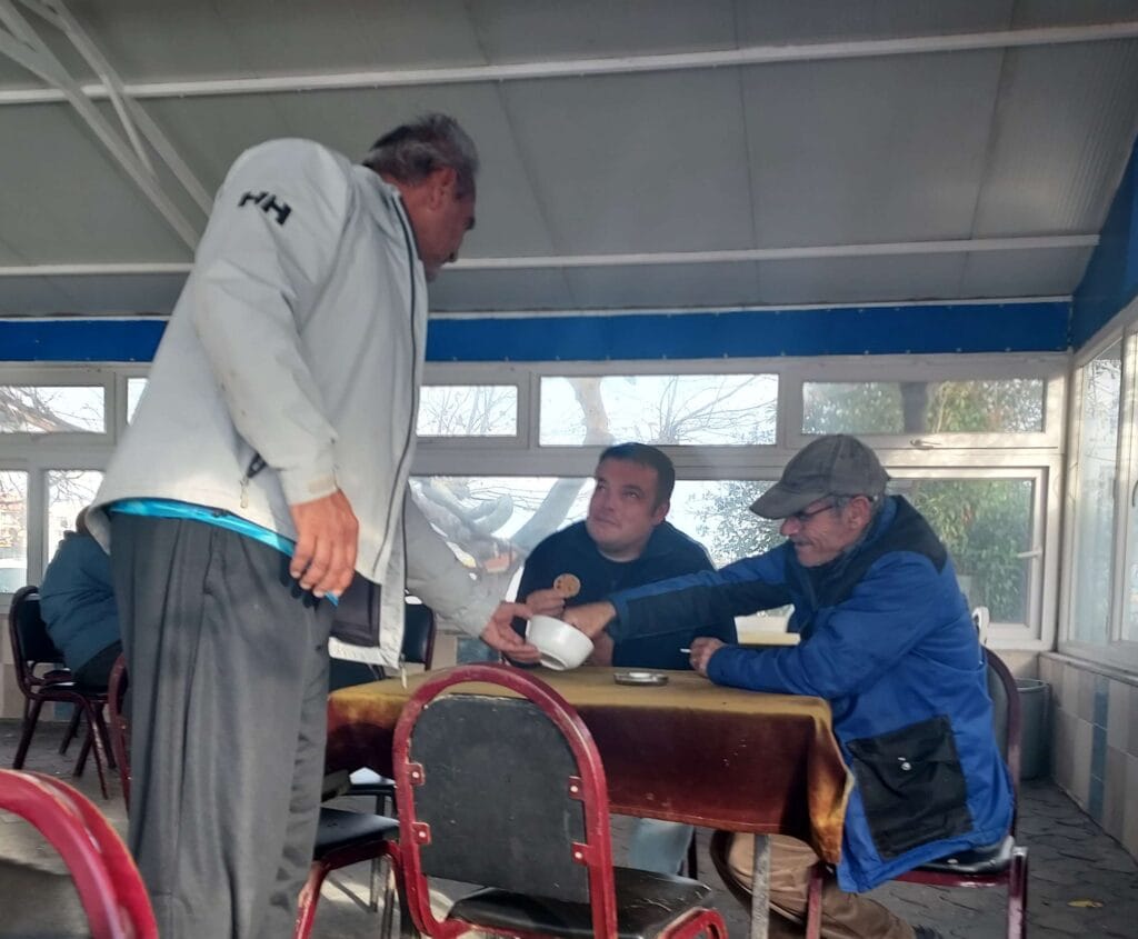 There was no power pedestal in sight. My Navily app mentioned that the restaurant offered electricity for a fee, but it was closed in winter. Gilles asked one of the men: “Elektrik?” He offered to run our extension cable to his little fishing hut on the quay, where he had power. We were so happy that we spontaneously gave him three beers (again from Greece — Mythos), which he accepted in surprise for himself and his two friends.