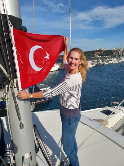 This once led to a funny misunderstanding. We wanted to dock in an industrial harbour due to lack of space elsewhere. A man came over to help us. I wanted to show how quickly the wind was pushing our boat off the quay, so we needed to act fast. I pointed at the flag in our mast to show wind direction — and when I pointed at the Turkish flag, the man immediately placed his hand on his heart and nodded enthusiastically.