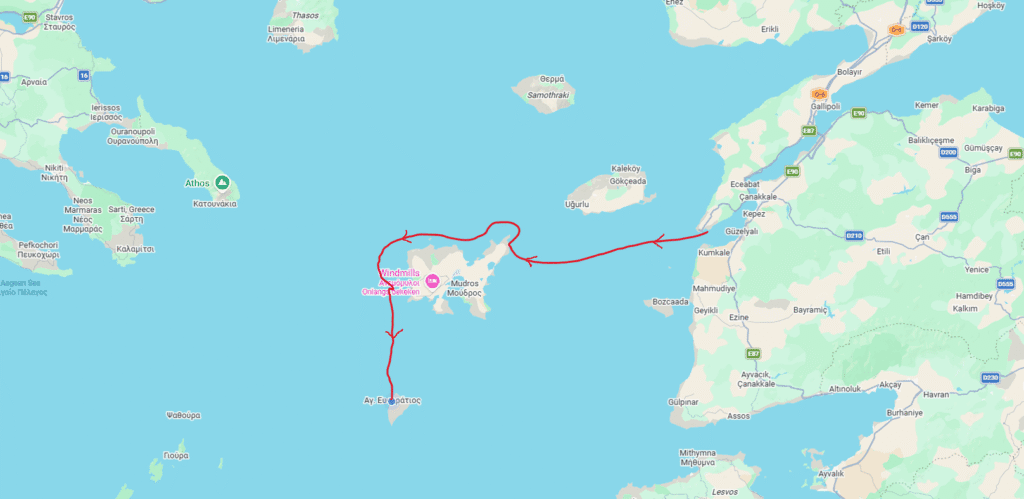 The crossing went smoothly; the wind was even more in our favor than forecasted, so at 16:00 we arrived on the east side of Limnos.