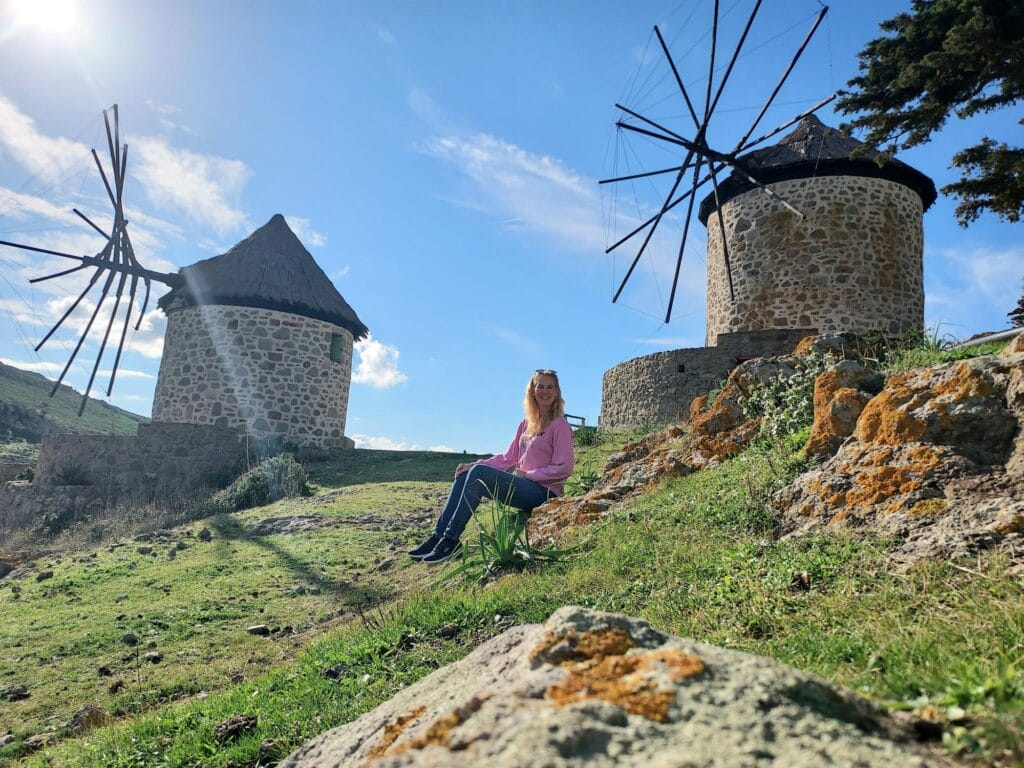 We walked back to the car and headed towards the village of Kontias, where windmills stand out beautifully against the green landscape. The village itself breathes creativity, with small galleries, artisanal shops, and charming squares. This is Limnos at its most artistic — quiet, yet full of character.