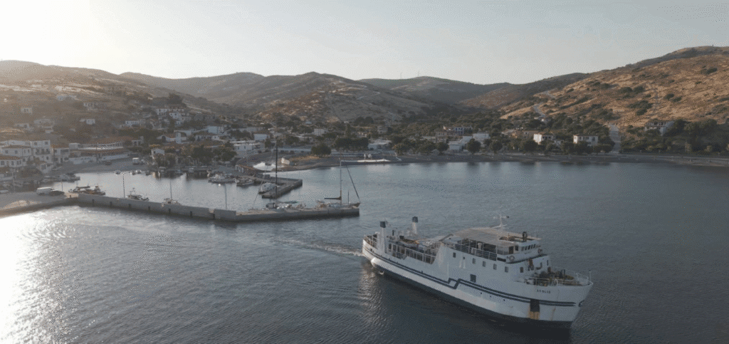 We sailed to a small island south of Limnos, because the next island (Lesbos) would have been too challenging to reach in those winds. We spent two enjoyable days in a small harbor there, and it was surprising to see a large ferry docking next to us twice a day. About fifteen minutes before arrival, the quay filled with cars, and we learned that the ferry island-hops its way to Athens in about 12 hours.