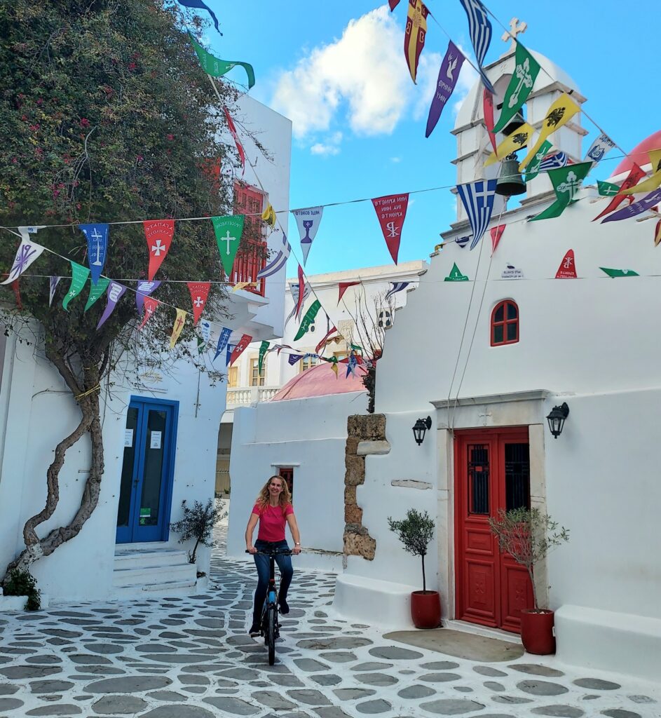 It truly feels like cycling through a Greek travel brochure when you ride through Mykonos.