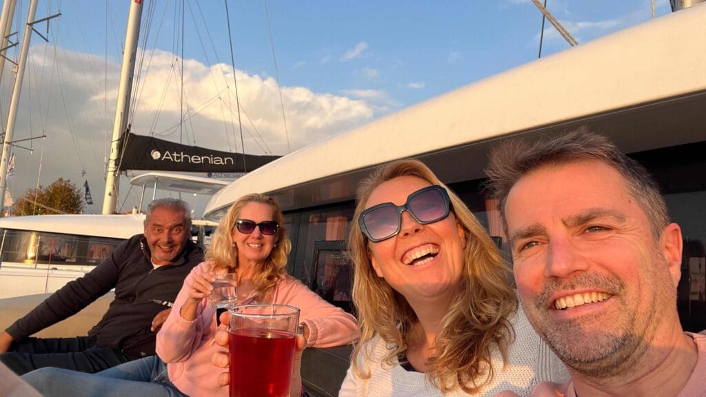 What an amazing week we had on board with our dear friends Laura & Gilles! From the moment we stepped on board, we felt completely at home. Their warm friendship, relaxed atmosphere, and natural hospitality made every day feel like pure enjoyment. We sailed along the Greek coast and around the island of Thassos, where we enjoyed delicious food, shared wonderful moments taking in the surroundings, and had great fun playing cards together. In between, there was always time for a good conversation, a swim in the crystal-clear water, or simply doing nothing with a drink in hand. Laura & Gilles truly know how to create a relaxed, cozy, and warm atmosphere. It was a week full of friendship, fun, and beautiful memories—we stepped off the boat with full hearts and smiles from ear to ear. Thank you so much for everything… and we’re already looking forward to our next trip together!